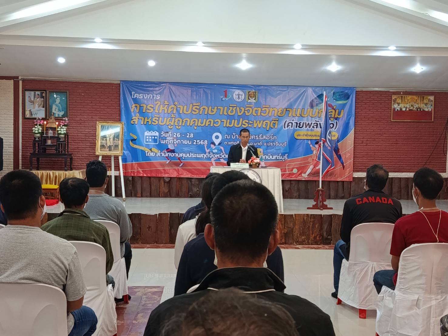 วันที่ 27 พฤศจิกายน 2568 เวลา 10.00 นาฬิกา นายวิชาญ สุขสวัสดิ์ ผู้อำนวยการสำนักงานคุมประพฤติจังหวัดปราจีนบุรี ร่วมพิธีเปิดโครงการให้คำปรึกษาเชิงจิตวิทยาแบบกลุ่มสำหรับผู้ถูกคุมความประพฤติ “ค่ายพลังใจ” ประจำปีงบประมาณ พ.ศ. 2569 ระหว่างวันที่ 26 - 28 พฤศจิกายน 2568 จัดโดยสำนักงานคุมประพฤติจังหวัดปราจีนบุรี สาขากบินทร์บุรี ซึ่งได้รับเกียรติจากนายสมใจ พุทธเสนา นายอำเภอนาดี มาเป็นประธานในพิธีเปิด ฯลฯ ณ บ้านคณิศร รีสอร์ท ตำบลแก่งดินสอ อำเภอนาดี จังหวัดปราจีนบุรี
